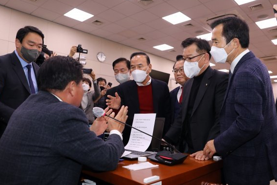 ▲ 국회 농림축산식품해양수산위원회 여당 간사인 이양수 의원과 국민의힘 의원들이 28일 열린 농림축산식품해양수산위원회전체회의에서 양곡관리법 개정안 본회의 직회부 안건 상정에 앞서 항의하고 있다. |