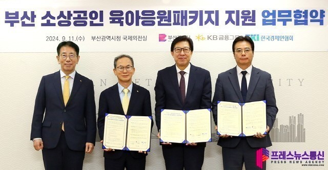[프레스뉴스] 류현주 기자= KB금융그룹(회장 양종희)은 11일 부산시청에서 박형준 부산시장, 양종희 KB금융그룹 회장, 이재근 KB국민은행장, 이상윤 한국경제인협회 지속가능성장본부장이 참석한 가운데, 부산시·한국경제인협회 (이하 한경협)와 소상공인의 출산·육아 지원을 위해 총 30억원을 지원하는 「부산 소상공인 육아응원패키지 지원 업무협약(MOU)」을 체결했다.