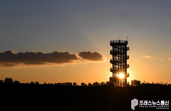 [프레스뉴스] 장현준 기자= 흔들전망대에 걸려 있는 일몰이 아름다운 시흥시 갯골생태공원, 평화롭게 거니는 시민들의 모습에는 여유가 묻어난다.
