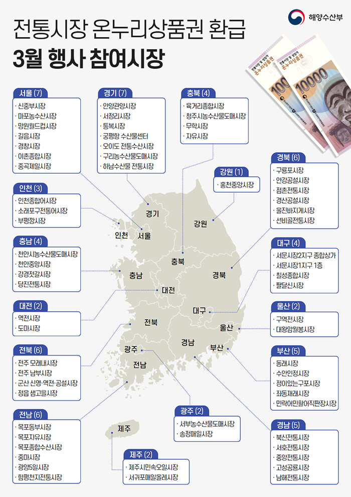 | ▲전통시장 온누리상품권 환급 3월 행사 참여 시장. (인포그래픽=해양수산부) |