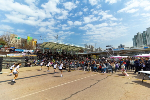| ▲‘폴짝폴짝 봄’_시민들이 30일 안양충훈벚꽃축제에서 안양시민공연단인 벚꽃프린지(지역예술공연)의 줄넘기공연을 보고 있다.(사진=안양시) |