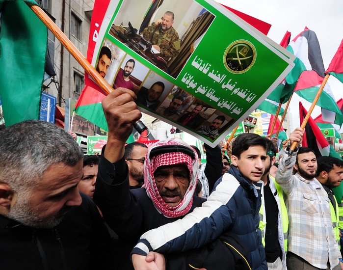 [프레스뉴스] 채정병 특파원=5일(현지시간) 가자지구 팔레스타인 연대행진이 요르단 암만 후세이니 모스크 앞에서 열린 가운데 한 노인이 이스라엘의 드론 공격으로 레바논 베이루트 인근에서 살해된 하마스 정치국 2인자 살라 알 아루리의 사진을 들고 이스라엘을 규탄하고 있다.