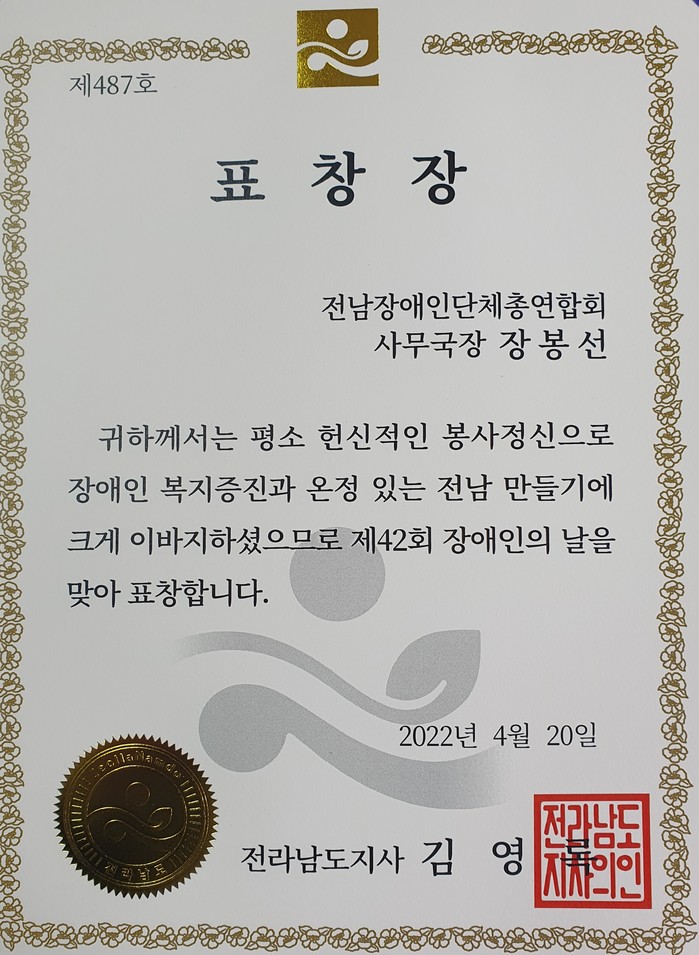 [전남=프레스뉴스]강래성 기자= 장봉선 신안제2지구 도의원 예비후보가 제42회 장애인의 날을 맞아 전남도지사 표창을 수상했다.