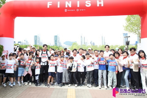 ▲최대호 안양시장이 6일 평촌중앙공원에서 안양시와 세이브더칠드런이 함께하는 국제어린이마라톤의 참여자들과 기념촬영을 하고 있다.(사진=안양새) |