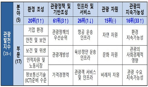 한편 세계경제포럼은 이번에 발표한 ‘2023년 관광발전지수’는 지표의 구성과 산정 방식 등을 일부 더 수정·보완한 결과라고 밝혔다.