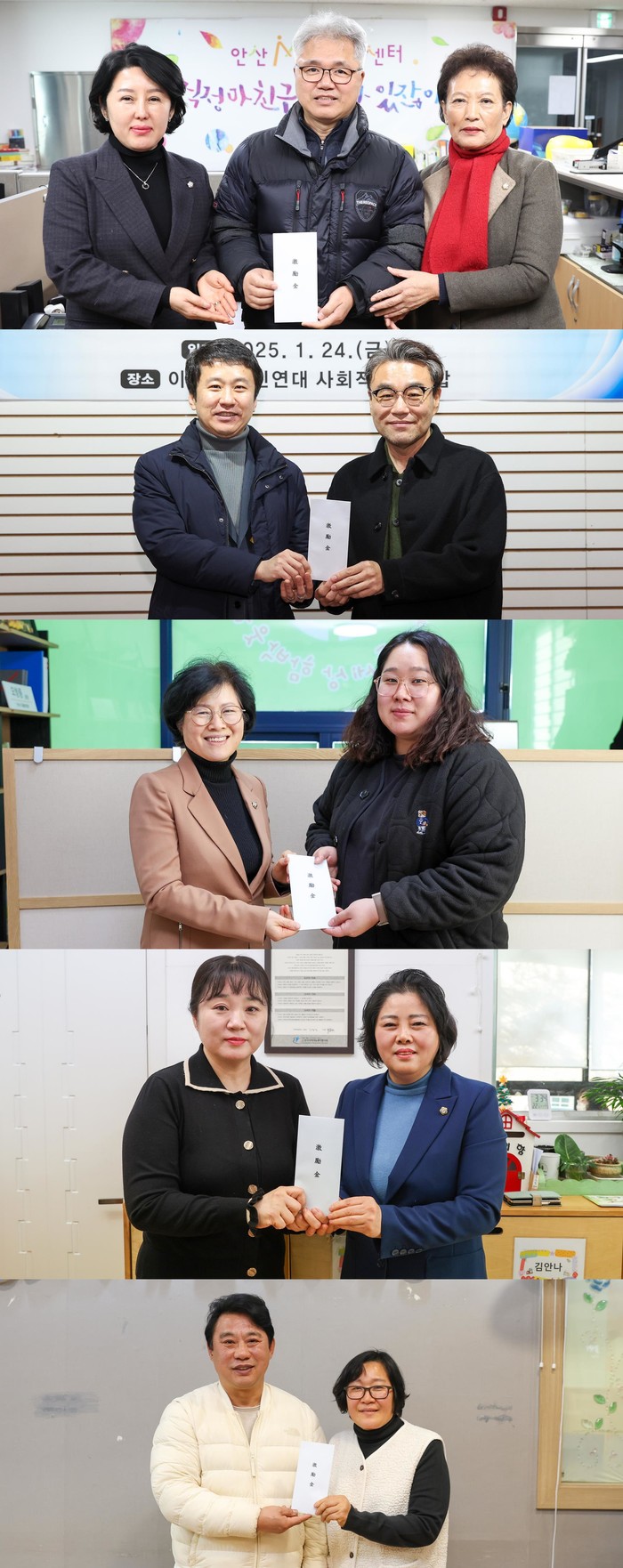 ▲안산시의회 의원들이 24일 지역 복지시설 5곳을 위문했다. 사진 위부터 차례대로 의원들이 안산이주민센터와 이주민시민연대 사회적협동조합, 아이들세상 함박웃음, 상록지역아동센터, 함께 꿈꾸는 세상을 방문한 모습.(사진=안산시의회) |