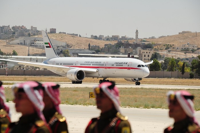 [프레스뉴스] 채정병 특파원=2일(현지시간) 요르단 공식 방문을 위해 셰이크 무함마드 빈 자이드 아랍에미레이트(UAE) 대통령을 태운 전용기가 암만 마르카 공항에 도착하고 있다.