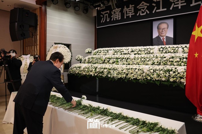 윤 대통령은 헌화와 묵념으로 장 前 주석을 추모한 뒤 싱 하이밍 주한중국대사에게 “작년 노태우 전 대통령 그리고 올해 장쩌민 前 주석까지, 한 중 두 나라 간 다리를 놓은 분들이 세상을 떠나셨다. 이제 후대가 잘 이어서 (한중 관계를) 발전시켜 나가자”라고 말했다.