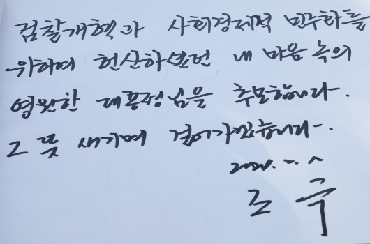 조국 전 법무부 장관이 12일 오후 경남 김해시 진영읍 봉하마을을 찾아 고 노무현 전 대통령 묘역을 참배한 후 방명록을 작성했다.