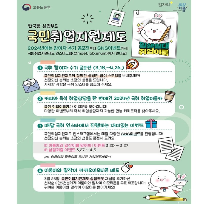 공모전, 취업이룸카, 온라인 참여형 이벤트 등에 대한 자세한 정보는 고용노동부 국민취업지원제도 인스타그램(@moel.job.erum)에서 확인할 수 있다.