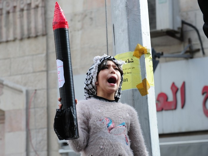 [프레스뉴스] 채정병 특파원=5일(현지시간) 가자지구 팔레스타인 연대행진이 요르단 암만 후세이니 모스크 앞에서 열린 가운데 한 소녀가 모형 미사일을 들고 이스라엘을 강하게 규탄하고 있다.