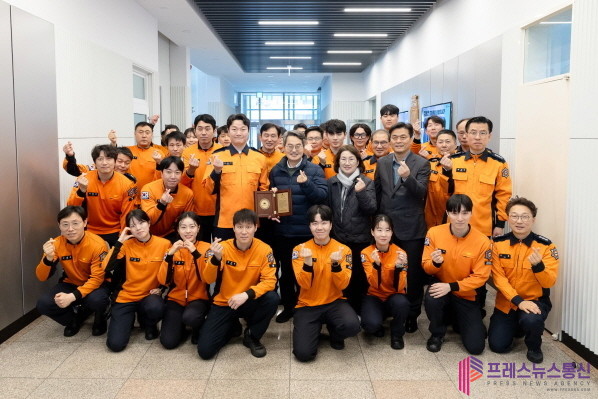 | ▲김동연 경기도지사가 14일 수원남부소방서를 찾아 설 연휴 특별경계근무 중인 소방공무원들을 격려하고 기념촬영을 하고 있다.(사진=경기도) |