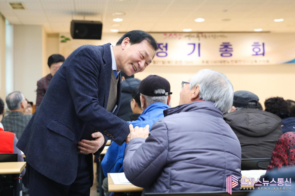 ▲의회는 20명의 의원들이 의정의 모세혈관처럼 기능하며 현장의 목소리를 청취하는 노력을 기울일 것이라고 다짐했다. 사진은 지난 1월 21일 상록구 노인지회 정기총회에서 박태순 의장이 한 시민과 악수를 나누고 있는 모습.(사진=안산시의회) |