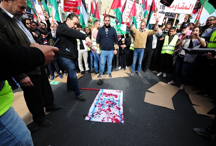 [프레스뉴스] 채정병 특파원=5일(현지시간) 가자지구 팔레스타인 연대행진이 요르단 암만 후세이니 모스크 앞에서 열린 가운데 한 남성이 이스라엘 국기 위에 피의 보복을 나타내는 붉은색 물감을 뿌리고 있다.
