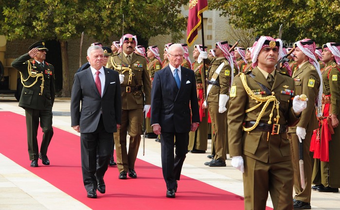 [프레스뉴스] 채정병 특파원=15일(현지시간) 칼 구스타프 16세 스웨덴 국왕이 요르단을 국빈 방문한 가운데 알 후세이니아 궁전 환영식에서 압둘라 2세 요르단 국왕과 함께 의장대를 사열하고 있다.