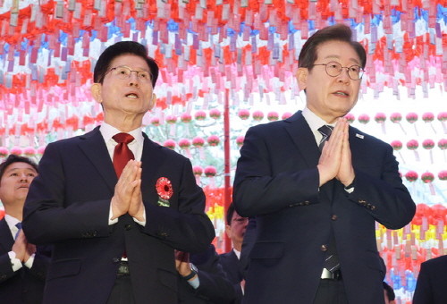 ▲지난 5일 이재명 더불어민주당 대선 후보와 김문수 국민의힘 대선 후보가 서울 종로구 조계사에서 열린 부처님오신날 봉축법요식에서 합장하고 있다. |