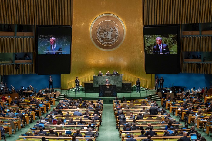 | ▲ 압둘라 2세 요르단 국왕이 제78차 유엔총회 연설에서 각국 대표들을 향해 연설하고 있다.(사진=요르단왕실 제공) |