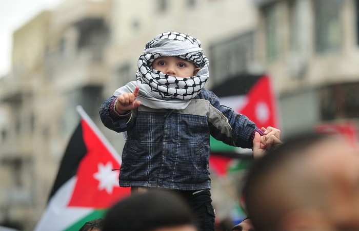 [프레스뉴스] 채정병 특파원=도널드 트럼프 미국 대통령이 발표한 이집트와 요르단으로의 가자주민 이주계획에 대해 아랍권이 들끓고 있는 상황에서 7일(현지시간) 요르단 전역에서 트럼프 계획에 반대하는 시민들이 거리로 나와 미국과 이스라엘을 강력히 규탄하고, 이미 트럼프에게 거부의사를 밝힌 압둘라 2세 요르단 국왕을 지지하는 가운데 수도 암만 다운타운에서 열린 시위에서 아빠와 함께 한 아기가 팔레스타인 전통두건 코피아를 두르고 행렬을 따라가고 있다.