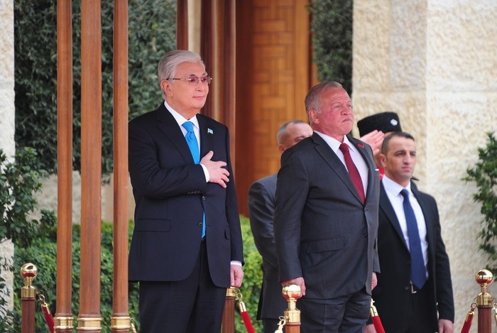 [프레스뉴스] 채정병 특파원=19일(현지시간) 압둘라 2세 요르단 국왕 초청으로 요르단을 공식 방문한 카심 조마르트 토카예프 카자흐스탄 대통령 환영식이 알 후세이니아 궁전에서 열린 가운데 카자흐스탄 국가가 연주되고 있다.