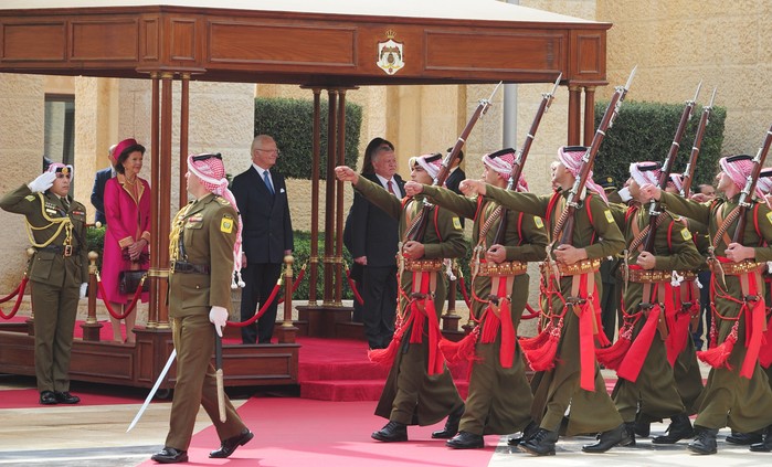 [프레스뉴스] 채정병 특파원=15일(현지시간) 칼 구스타프 16세 스웨덴 국왕 내외가 요르단을 국빈 방문한 가운데 알 후세이니아 궁전 환영식에서 요르단 왕실 의장대를 사열하고 있다.