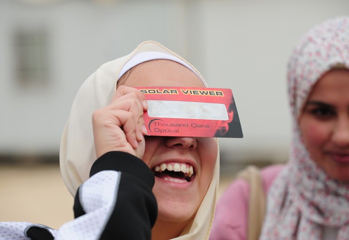 [프레스뉴스] 채정병 특파원=25일(현지시간) 요르단에서 예고된 부분일식이 오후 1시에서 3시 반 사이에 진행된 가운데 암만 시타델(성채)에서 열린 일식 관측 행사에서 한 여학생이 눈에 보안필터를 대고 태양을 보고 있다.
