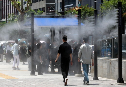 | ▲초여름 날씨를 보인 4일 부산 동구 부산역 앞을 지나는 시민들 사이로 쿨링포그가 가동되고 있다.(사진= 뉴스1) |