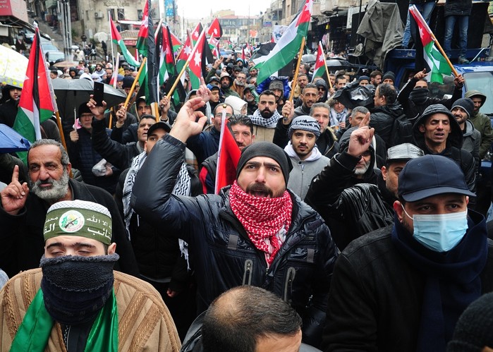 [프레스뉴스] 채정병 특파원=도널드 트럼프 미국 대통령이 발표한 이집트와 요르단으로의 가자주민 이주계획에 대해 아랍권이 들끓고 있는 상황에서 7일(현지시간) 요르단 전역에서 트럼프 계획에 반대하는 시민들이 거리로 나와 미국과 이스라엘을 강력히 규탄하고, 이미 트럼프에게 거부의사를 밝힌 압둘라 2세 요르단 국왕을 지지하는 가운데 수도 암만 다운타운에서 열린 시위에서 시민들이 분노하고 있다.