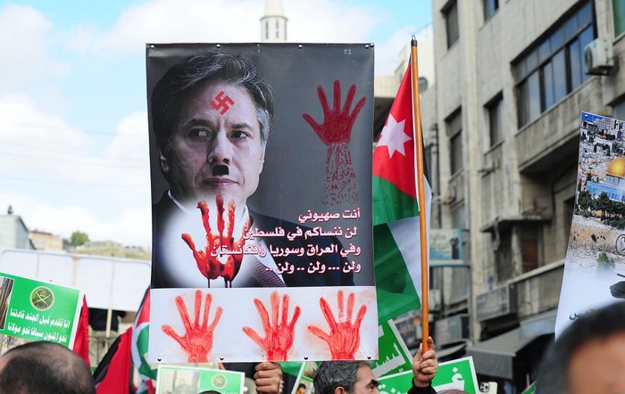 [프레스뉴스] 채정병 특파원=5일(현지시간) 가자지구 팔레스타인 연대행진이 요르단 암만 후세이니 모스크 앞에서 열린 가운데 시민들이 토니 블링컨 미국 국무장관을 나치 히틀러에 비유한 사진을 들고 행진하고 있다.