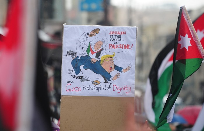 [프레스뉴스] 채정병 특파원=도널드 트럼프 미국 대통령이 발표한 이집트와 요르단으로의 가자주민 이주계획에 대해 아랍권이 들끓고 있는 상황에서 7일(현지시간) 요르단 전역에서 트럼프 계획에 반대하는 시민들이 거리로 나와 미국과 이스라엘을 강력히 규탄하고, 이미 트럼프에게 거부의사를 밝힌 압둘라 2세 요르단 국왕을 지지하는 가운데 수도 암만 다운타운에서 트럼프 응징을 묘사하는 카툰을 들고 시위를 벌이고 있다.
