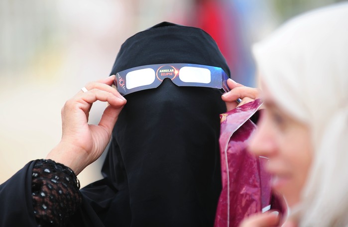 [프레스뉴스] 채정병 특파원=25일(현지시간) 요르단에서 예고된 부분일식이 오후 1시에서 3시 반 사이에 진행된 가운데 암만 시타델(성채)에서 열린 일식 관측 행사에서 한 여성이 보안경을 쓰고 태양을 보고 있다.