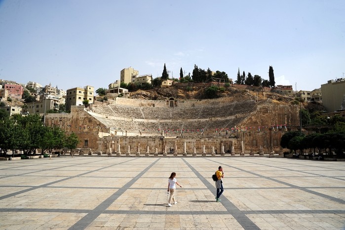 | ▲ 요르단의 대표적 유적지 암만 로마 원형극장 경내가 폭염으로 한산한 가운데 여행자들이 광장을 걷고 있다. |
