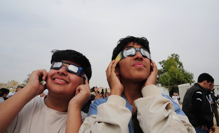 [프레스뉴스] 채정병 특파원=25일(현지시간) 요르단에서 예고된 부분일식이 오후 1시에서 3시 반 사이에 진행된 가운데 암만 시타델(성채)에서 열린 일식 관측 행사에서 남학생들이 보안경을 쓰고 태양의 변화를 관찰하고 있다.