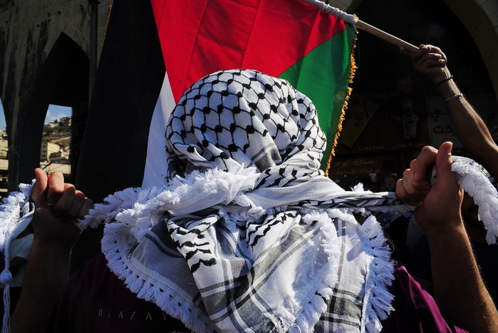 [프레스뉴스] 채정병 특파원=13일(현지시간) 가자지구에 대한 이스라엘의 무차별 공습에 분노한 요르단 시민 수천명이 암만 도심에서 이스라엘 규탄하는 가운데 한 남성이 팔레스타인 전통 두건 '코피아'를 동여매고 있다.