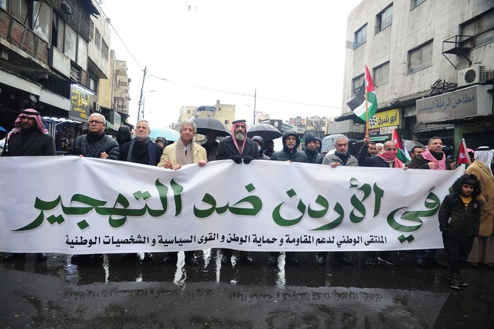 [프레스뉴스] 채정병 특파원=도널드 트럼프 미국 대통령이 발표한 이집트와 요르단으로의 가자주민 이주계획에 대해 아랍권이 들끓고 있는 상황에서 7일(현지시간) 요르단 전역에서 트럼프 계획에 반대하는 시민들이 거리로 나와 미국과 이스라엘을 강력히 규탄하고, 이미 트럼프에게 거부의사를 밝힌 압둘라 2세 요르단 국왕을 지지하는 가운데 수도 암만 다운타운에서 열린 시위에서 시민들이 가자주민의 이주를 반대한다는 플래카드를 들고 행진하고 있다.