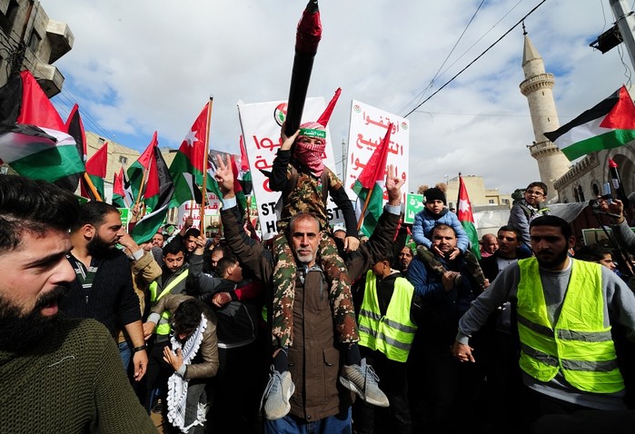 [프레스뉴스] 채정병 특파원=5일(현지시간) 가자지구 팔레스타인 연대행진이 요르단 암만 후세이니 모스크 앞에서 열린 가운데 모형 미사일을 든 아이와 시민들이 이스라엘 타도를 외치며 행진하고 있다.