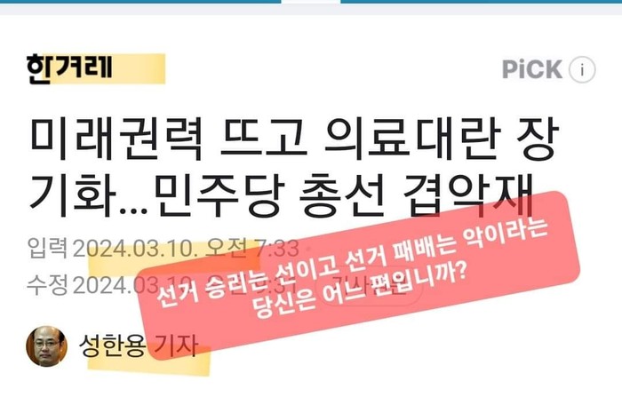 의사들을 자극하고 집단 반발을 유도한 뒤에 군사작전하듯이 때려 잡는 '강한 정부' 프레임을 씌워 표를 얻으려는 정략적인 카드였고 선거용은 아닌지 따지고, 정부의 일방적 결정에 입틀막이 아니라 지금이라도 공론의 장에서 민주적으로 해결하라고 요구하는 것이 또한 야당의 일이 아닌가. 한겨레의 칼럼이 그러해야 하고.