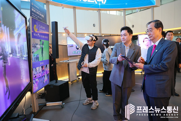 ▲한덕수 국무총리가 2일 경기도 판교 메타버스 허브센터에서 열린 ‘제3차 규제혁신 전략회의’에 참석, 회의에 앞서 메타버스 기업전시 부스를 둘러보며 체험하고 있다.(사진=국무조정실) |