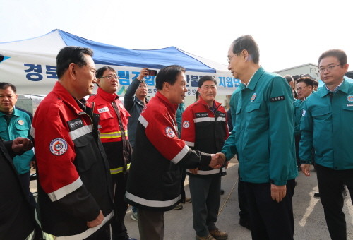 ▲한덕수 대통령 권한대행 국무총리가 24일 오후 경북 의성군 산불현장통합지휘본부를 방문해 근무자들을 격려하고 있다.(사진= 뉴스1) |