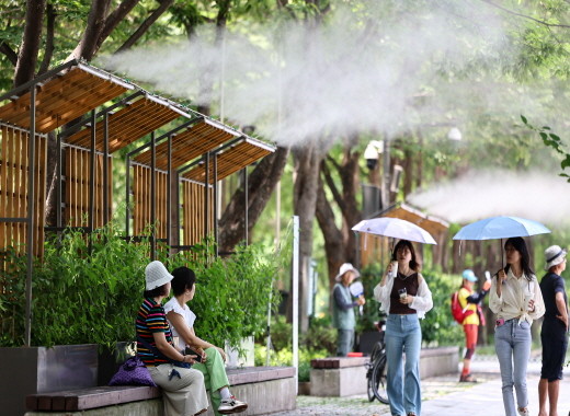 ▲폭염이 이어지고 있는 9일 서울 성동구 서울숲에서 시민들이 쿨링포그 아래 휴식을 취하고 있다.(사진= 뉴스1) |