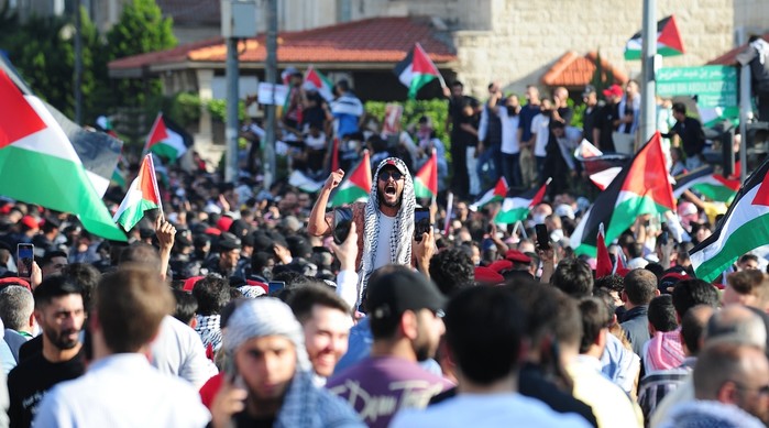 [프레스뉴스] 채정병 특파원=18일(현지시간) 가자지구 민간병원에 대한 폭격으로 중동과 아랍이 분노로 들끓는 가운데 요르단 주재 이스라엘 대사관 인근에서 열린 시위에서 한 남성이 시위대를 향해 저항구호를 외치고 있다.