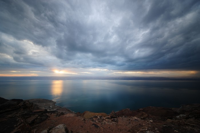 [프레스뉴스] 채정병 특파원=28일(현지시간) 먹구름 가득낀 사해 하늘에 석양이 비치고 있다.