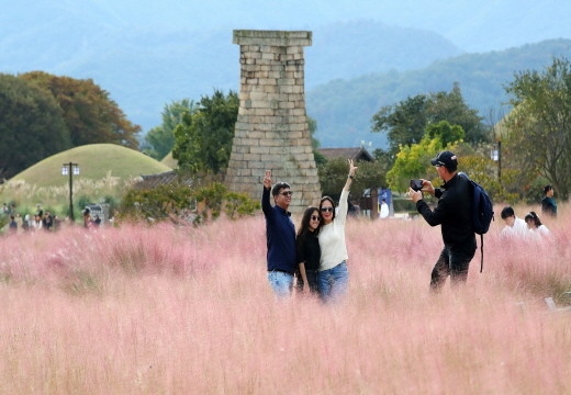 | ▲평년기온을 회복한 30일 오후 내외국인 관광객들이 경주 첨성대 주변에 곱게 물든 핑크뮬리와 첨성대를 배경으로 기념촬영을 하고 있다.(사진= 뉴스1) |