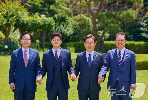 ▲이재명 대통령이 22일 서울 한남동 관저에서 여야 지도부와 가진 오찬에 앞서 기념촬영하고 있다. 왼쪽부터 송언석 국민의힘 원내대표, 김용태 비상대책위원장, 이 대통령, 김병기 더불어민주당 당대표 직무대행 겸 원내대표.(사진= 뉴스1) |
