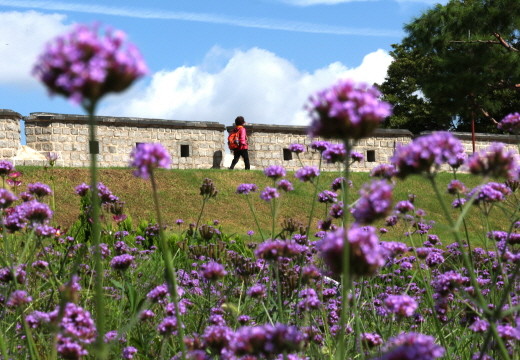 ▲2일 수원 팔달구 수원화성 장안문 인근 성곽에 버들마편초가 만개해 있다.(사진= 뉴스1) |
