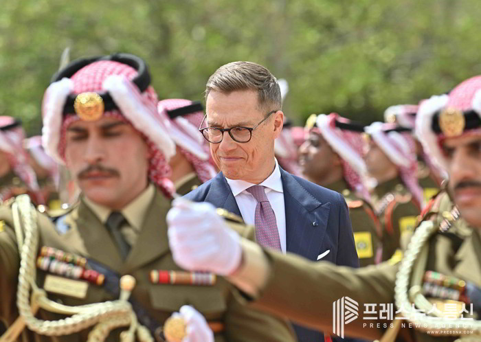 [프레스뉴스] 채정병 특파원=19일(현지시간) 요르단을 공식방문한 알렉산데르 스투브 핀란드 대통령이 알 후세이니아 궁전에서 요르단 왕실 의장대를 사열하고 있다. 이어 열린 회담에서 압둘라 2세 요르단 국왕은 현재 시기에 국제 협력이 그 어느 때보다 중요하다고 밝히며, 요르단이 핀란드와 유럽연합 등 파트너들과 지역 평화 실현을 위해 국제사회의 공동 노력을 더욱 강화할 필요성을 강조했다. (사진=채정병 특파원)