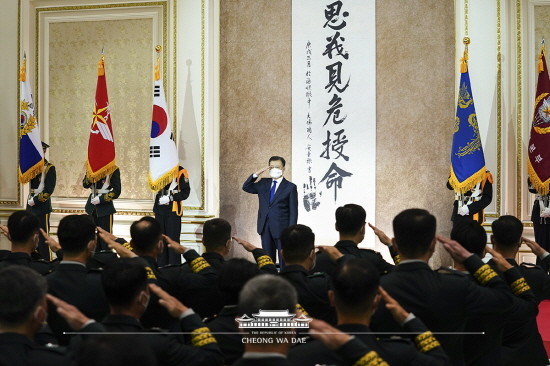이어 “군인의 길을 걷는 사람에게 처음으로 별을 달고 진급한다는 것만큼 가슴 뜨겁게 벅차고, 영광스러운 순간은 없을 것”이라며 이전 정부에서 국방부 장관이 대신했던 삼정검 수여를 우리 정부 들어 직접 하게 된 배경을 설명했다.