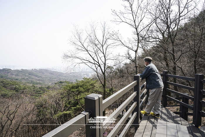 ▲ 문재인 대통령이 5일 북악산 남측 탐방로를 통해 청운대전망대에 오른 뒤 경치를 감상하고 있다 |