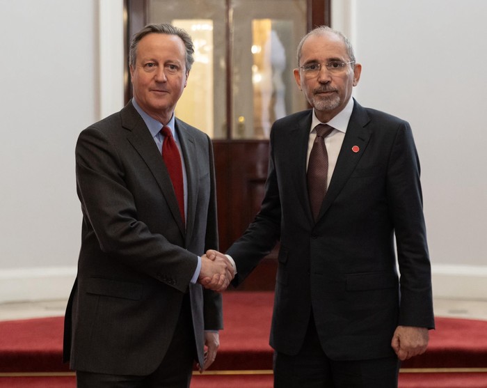 | 데이비드 캐머런(왼쪽) 영국 외무장관이 아이만 사파디 요르단 외무장관과 악수하고 있다. (사진=요르단 외무부 제공) |