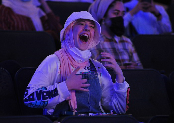 | 24일(현지시간) 한 여성 관객이 2021 케이팝 월드 페스티벌 요르단 예선을 보며 즐거워하고 있다. |