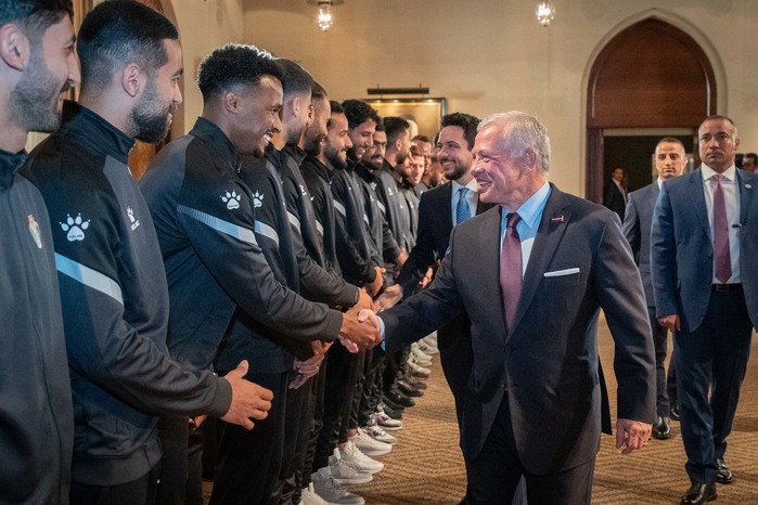 [프레스뉴스] 채정병 특파원=25일(현지시간) 2023년 AFC 아시안컵에서 준우승을 달성한 요르단 축구대표팀이 왕실로 초청돼 압둘라 2세 국왕과 악수를 나누고 있다. (사진=요르단 왕실 제공)